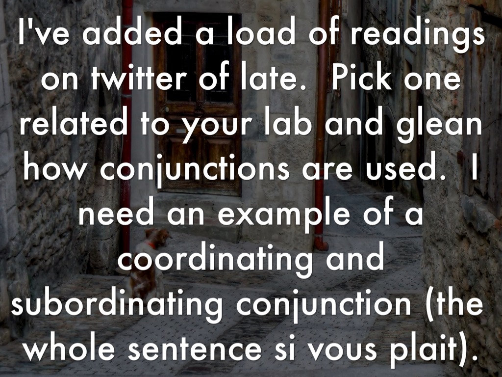 I've added a load of readings on twitter of late. Pick one related to your lab and glean how conjunctions are used. I need an example of a coordinating and subordinating conjunction (the whole sentence si vous plait).