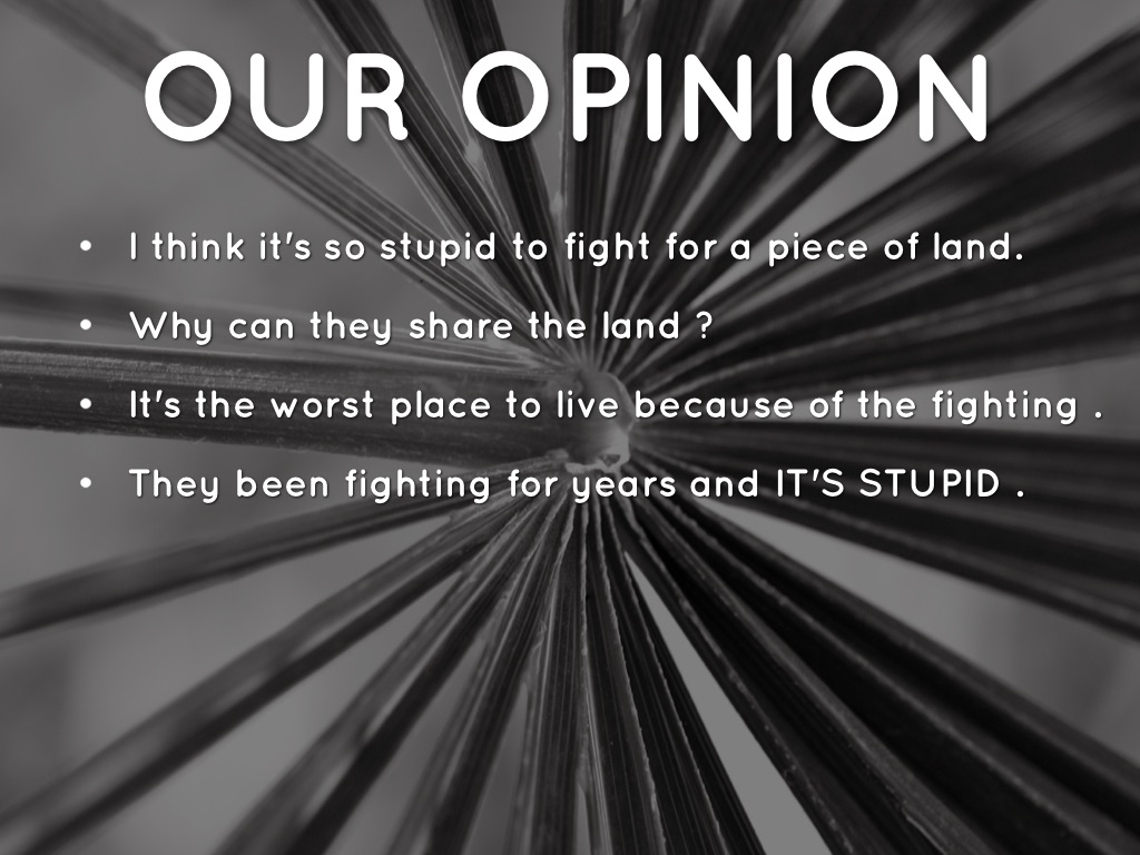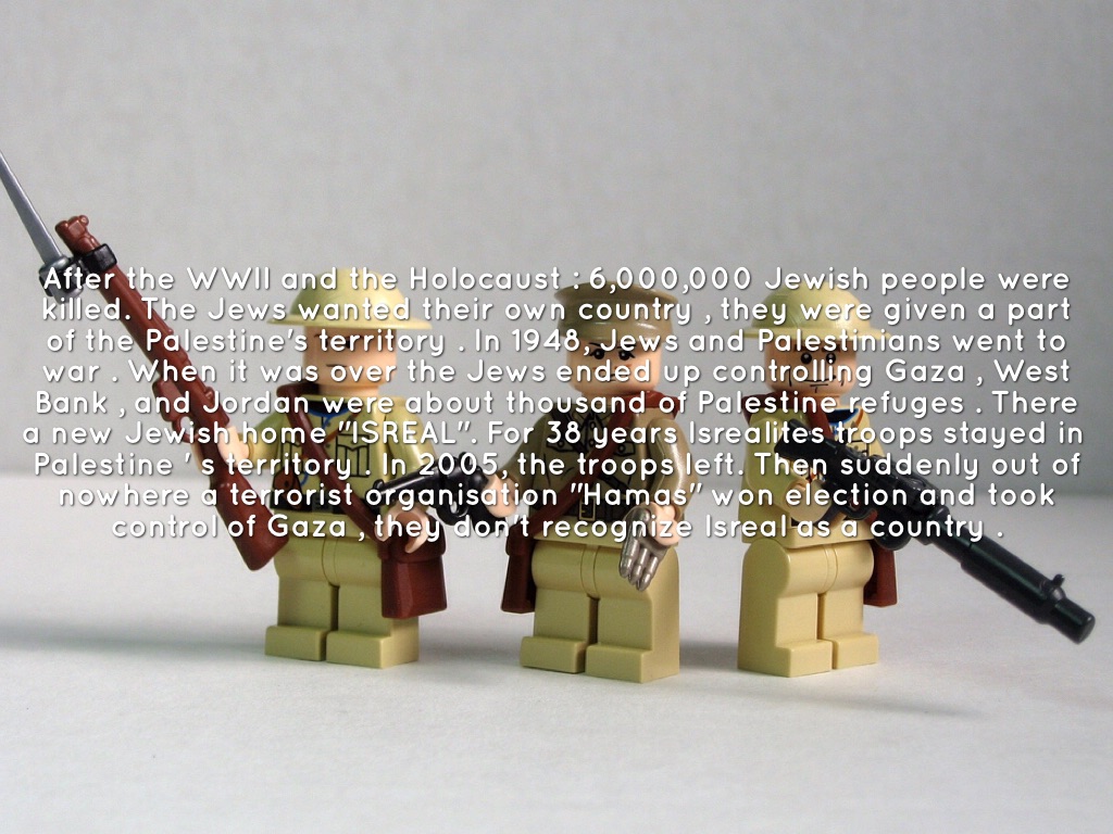 After the WWII and the Holocaust : 6,000,000 Jewish people were killed. The Jews wanted their own country , they were given a part of the Palestine's territory . In 1948, Jews and Palestinians went to war . When it was over the Jews ended up controlling Gaza , West Bank , and Jordan were about thousand of Palestine refuges . There a new Jewish home "ISREAL". For 38 years Isrealites troops stayed in Palestine ' s territory . In 2005, the troops left. Then suddenly out of nowhere a terrorist organisation "Hamas" won election and took control of Gaza , they don't recognize Isreal as a country .