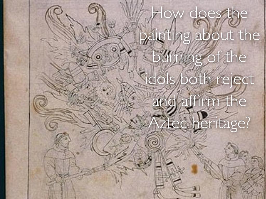 How does the painting about the burning of the idols both reject and affirm the Aztec heritage?
