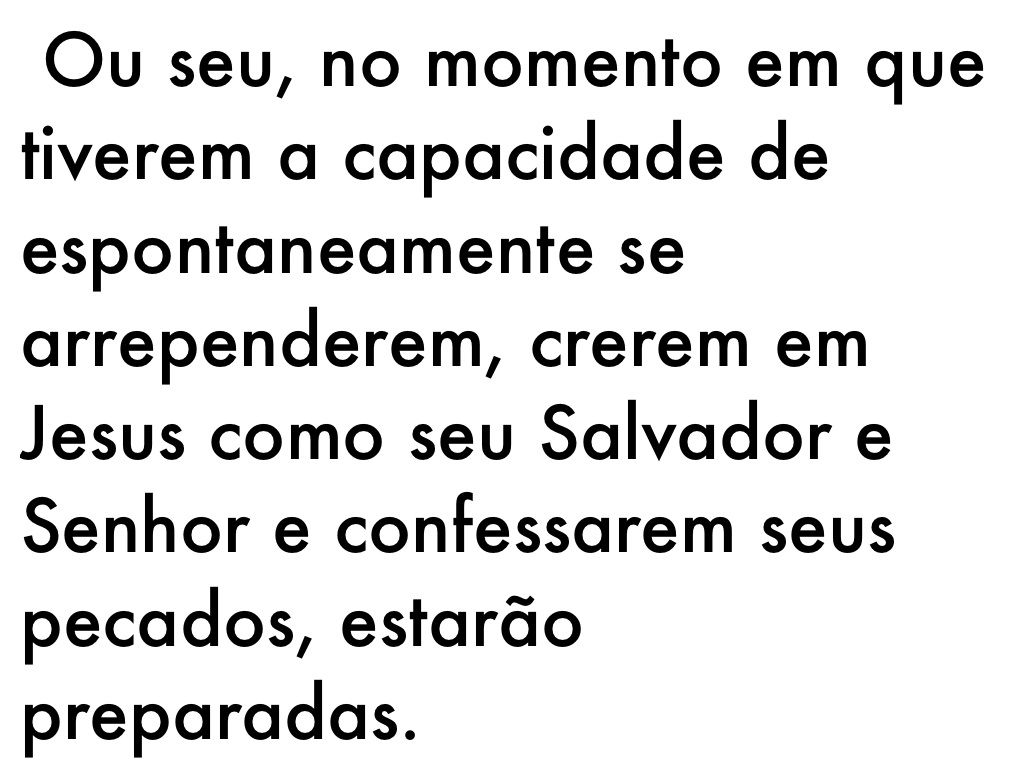 Ou seu, no momento em que tiverem a capacidade de espontaneamente se arrependerem, crerem em Jesus como seu Salvador e Senhor e confessarem seus pecados, estarão preparadas.