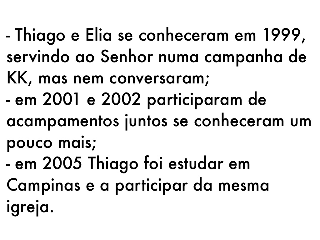 - Thiago e Elia se conheceram em 1999, servindo ao Senhor numa campanha de KK, mas nem conversaram;