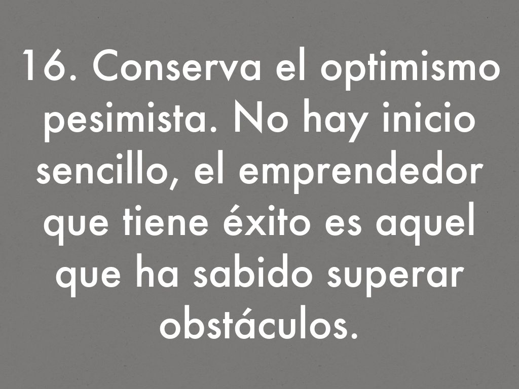 16. Conserva el optimismo pesimista. No hay inicio sencillo, el emprendedor que tiene éxito es aquel que ha sabido superar obstáculos.