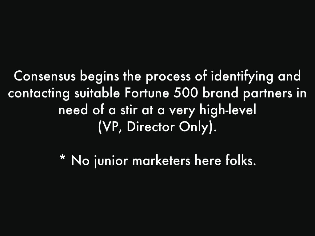 Consensus begins the process of identifying and contacting suitable Fortune 500 brand partners in need of a stir at a very high-level