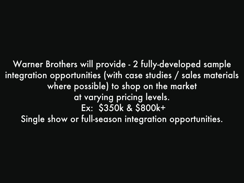 Warner Brothers will provide - 2 fully-developed sample integration opportunities (with case studies / sales materials where possible) to shop on the market