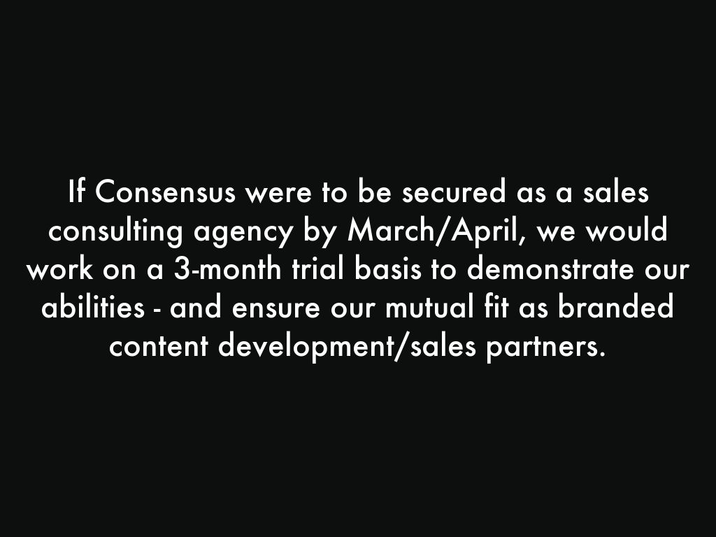 If Consensus were to be secured as a sales consulting agency by March/April, we would work on a 3-month trial basis to demonstrate our abilities - and ensure our mutual fit as branded content development/sales partners.