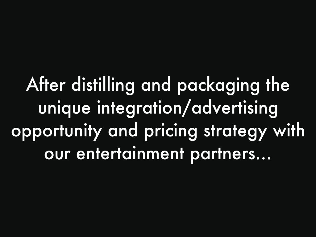 After distilling and packaging the unique integration/advertising opportunity and pricing strategy with our entertainment partners...