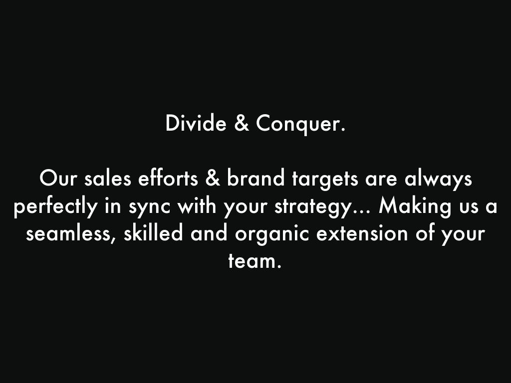 Our sales efforts & brand targets are always perfectly in sync with your strategy... Making us a seamless, skilled and organic extension of your team.