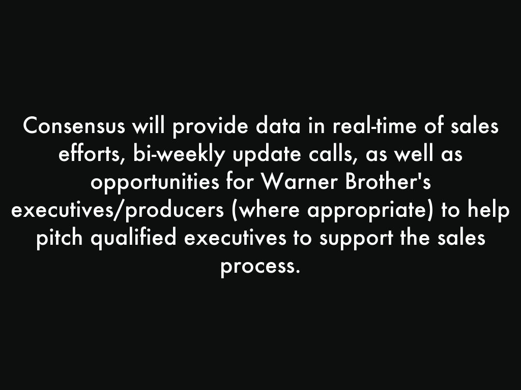 Consensus will provide data in real-time of sales efforts, bi-weekly update calls, as well as opportunities for Warner Brother's executives/producers (where appropriate) to help pitch qualified executives to support the sales process.