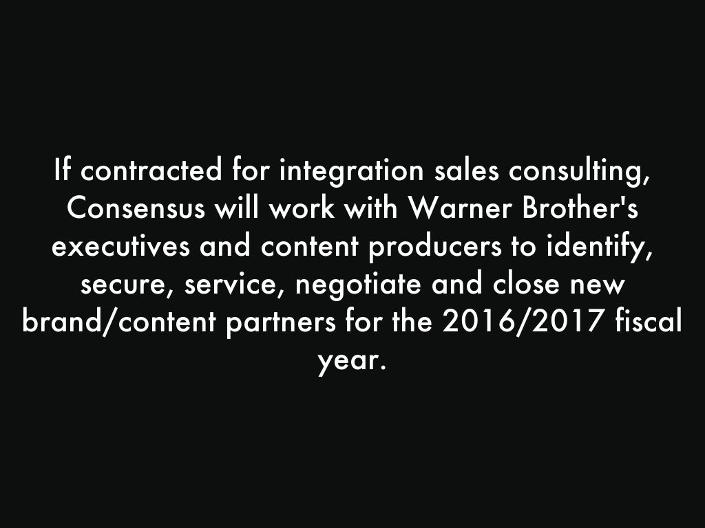 If contracted for integration sales consulting, Consensus will work with Warner Brother's executives and content producers to identify, secure, service, negotiate and close new brand/content partners for the 2016/2017 fiscal year.