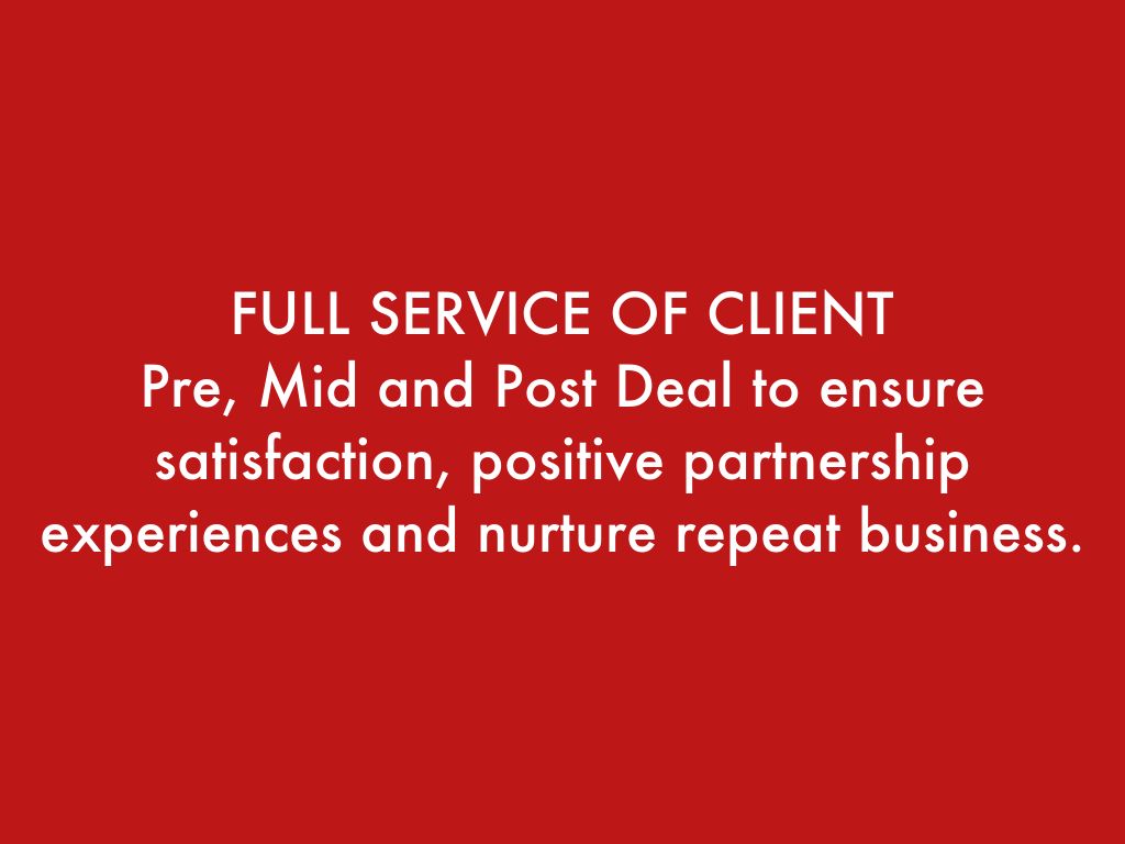 Pre, Mid and Post Deal to ensure satisfaction, positive partnership experiences and nurture repeat business.