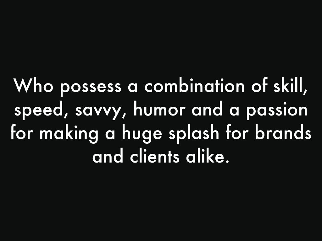 Who possess a combination of skill, speed, savvy, humor and a passion for making a huge splash for brands and clients alike.