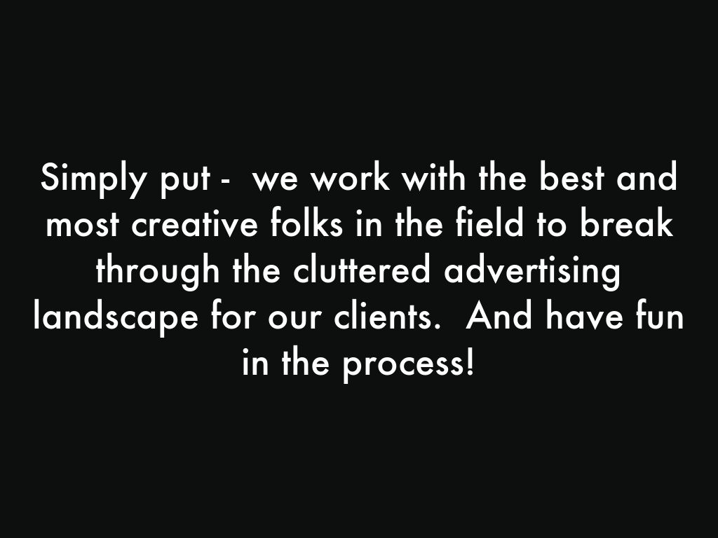 Simply put - we work with the best and most creative folks in the field to break through the cluttered advertising landscape for our clients. And have fun in the process!