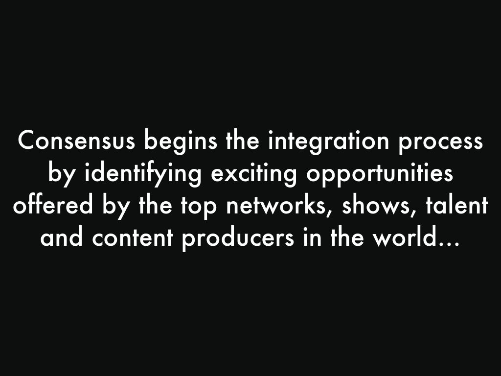 Consensus begins the integration process by identifying exciting opportunities offered by the top networks, shows, talent and content producers in the world...