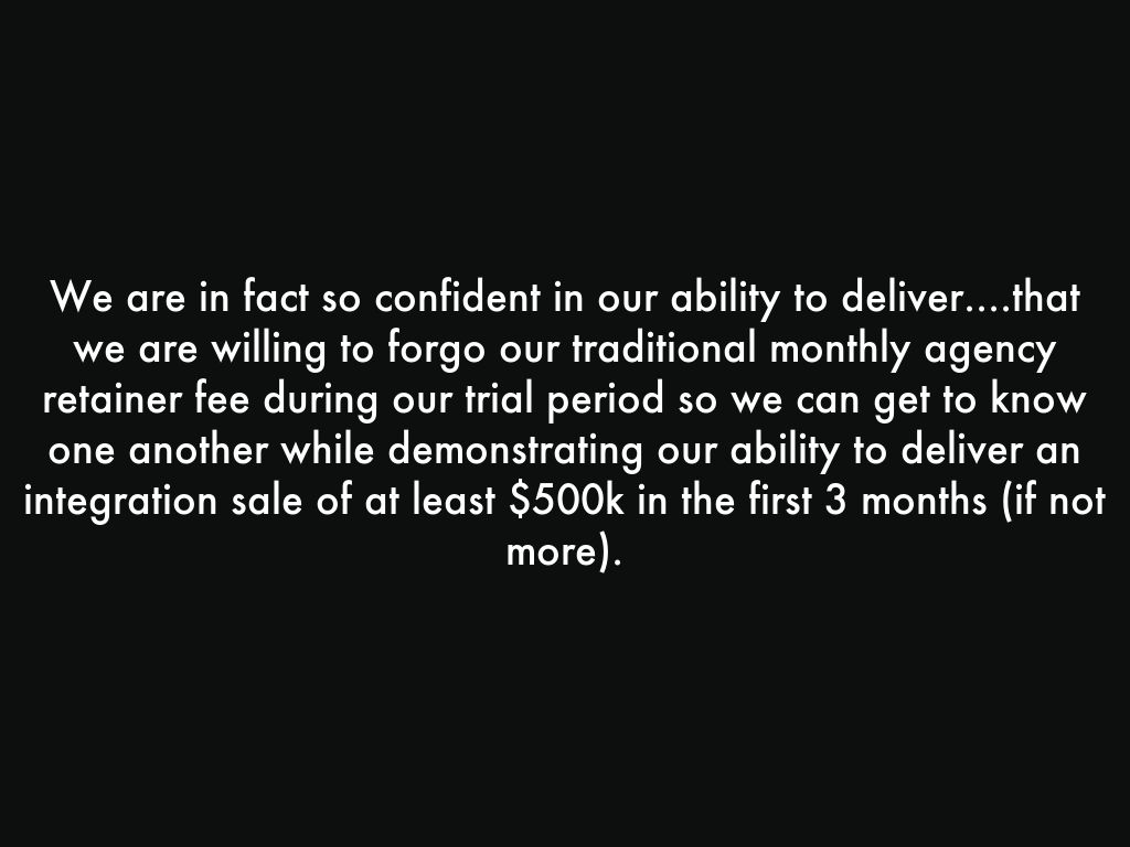 We are in fact so confident in our ability to deliver....that we are willing to forgo our traditional monthly agency retainer fee during our trial period so we can get to know one another while demonstrating our ability to deliver an integration sale of at least $500k in the first 3 months (if not more).