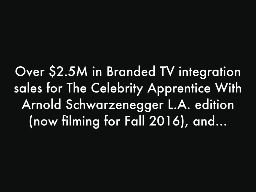 Over $2.5M in Branded TV integration sales for The Celebrity Apprentice With Arnold Schwarzenegger L.A. edition (now filming for Fall 2016), and...