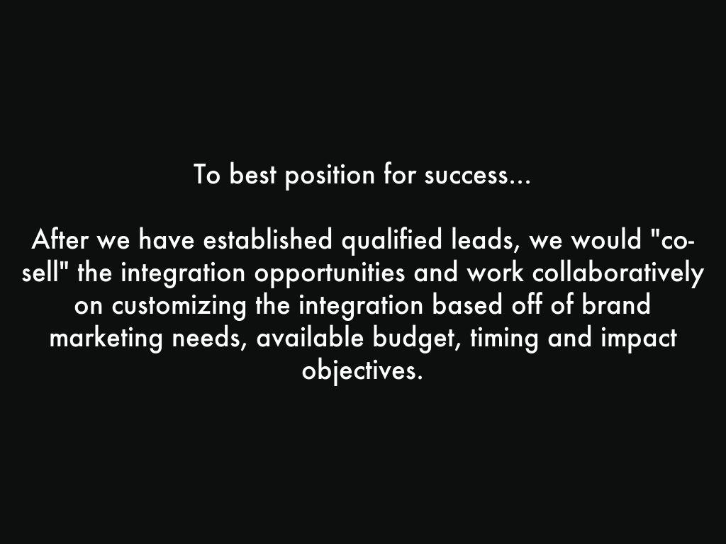 After we have established qualified leads, we would "co-sell" the integration opportunities and work collaboratively on customizing the integration based off of brand marketing needs, available budget, timing and impact objectives.