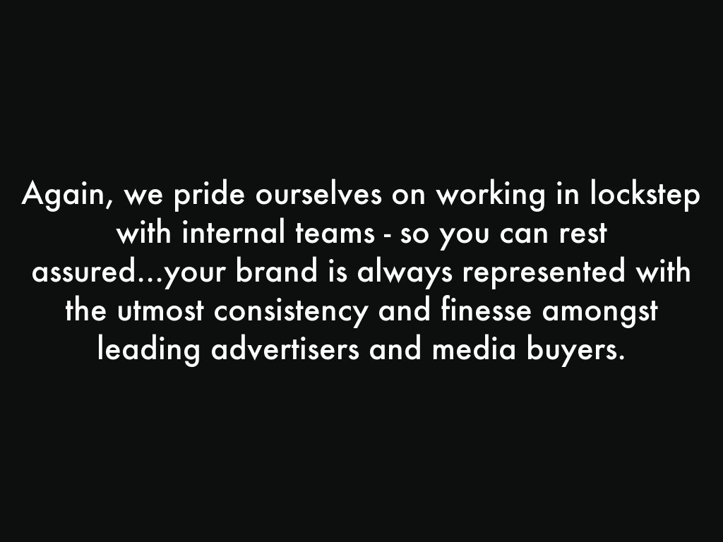Again, we pride ourselves on working in lockstep with internal teams - so you can rest assured...your brand is always represented with the utmost consistency and finesse amongst leading advertisers and media buyers.