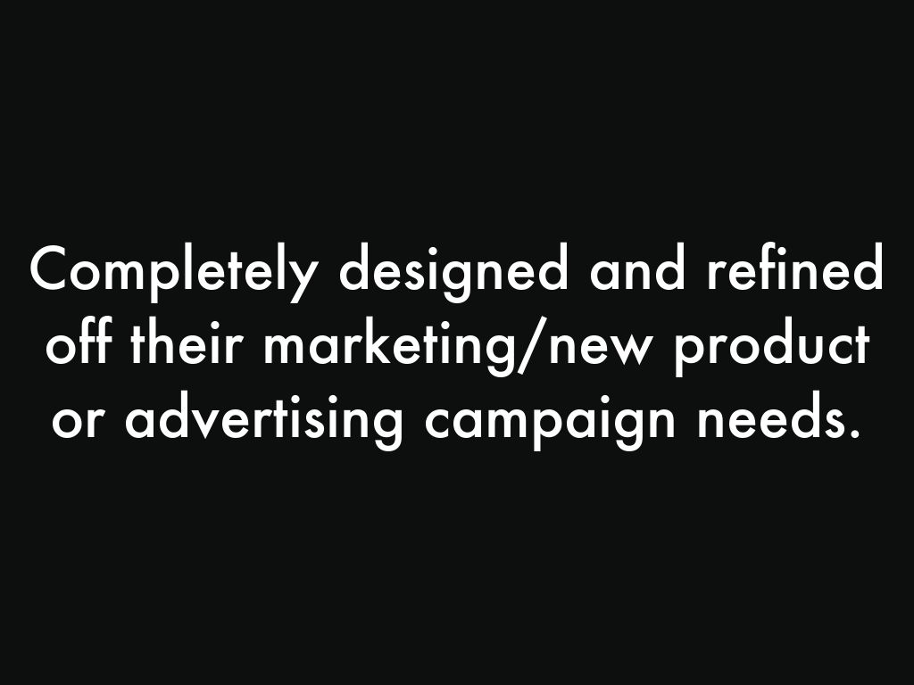 Completely designed and refined off their marketing/new product or advertising campaign needs.