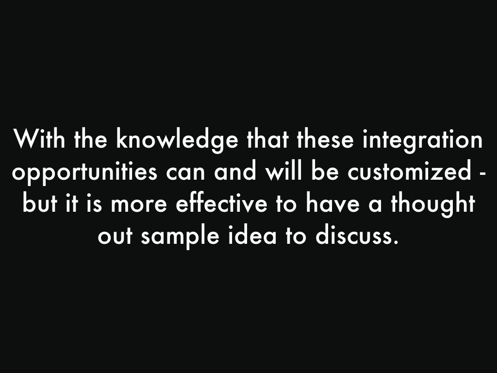 With the knowledge that these integration opportunities can and will be customized - but it is more effective to have a thought out sample idea to discuss.