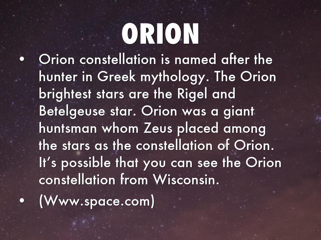 Orion constellation is named after the hunter in Greek mythology. The Orion brightest stars are the Rigel and Betelgeuse star. Orion was a giant huntsman whom Zeus placed among the stars as the constellation of Orion. It’s possible that you can see the Orion constellation from Wisconsin.