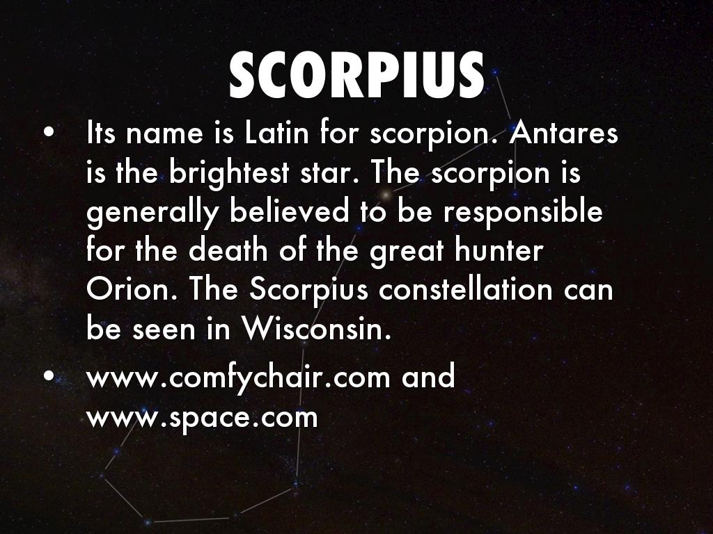 Its name is Latin for scorpion. Antares is the brightest star. The scorpion is generally believed to be responsible for the death of the great hunter Orion. The Scorpius constellation can be seen in Wisconsin.