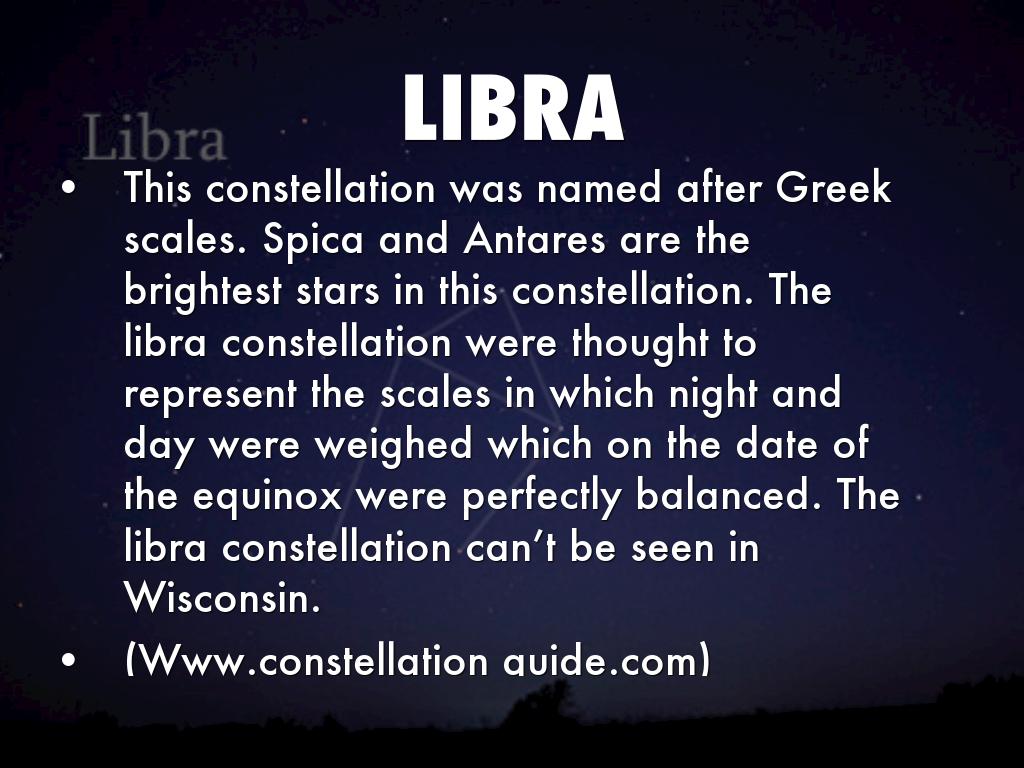 This constellation was named after Greek scales. Spica and Antares are the brightest stars in this constellation. The libra constellation were thought to represent the scales in which night and day were weighed which on the date of the equinox were perfectly balanced. The libra constellation can’t be seen in Wisconsin.