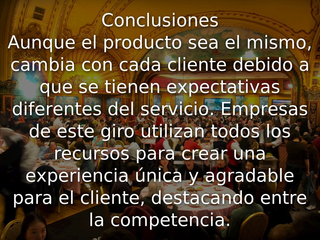 Conclusiones Aunque el producto sea el mismo, cambia con cada cliente debido a que se tienen expectativas diferentes del servicio. Empresas de este giro utilizan todos los recursos para crear una experiencia única y agradable para el cliente, destacando entre la competencia.
