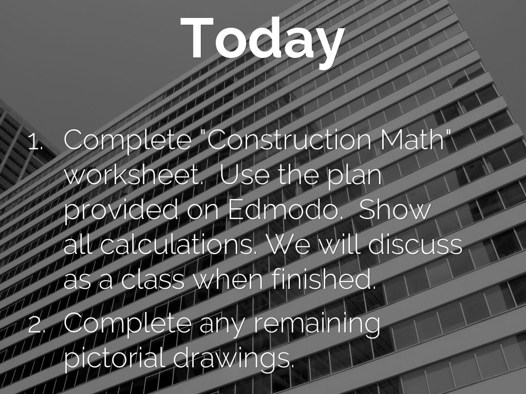 • Complete "Construction Math" worksheet. Use the plan provided on Edmodo. Show all calculations. We will discuss as a class when finished.