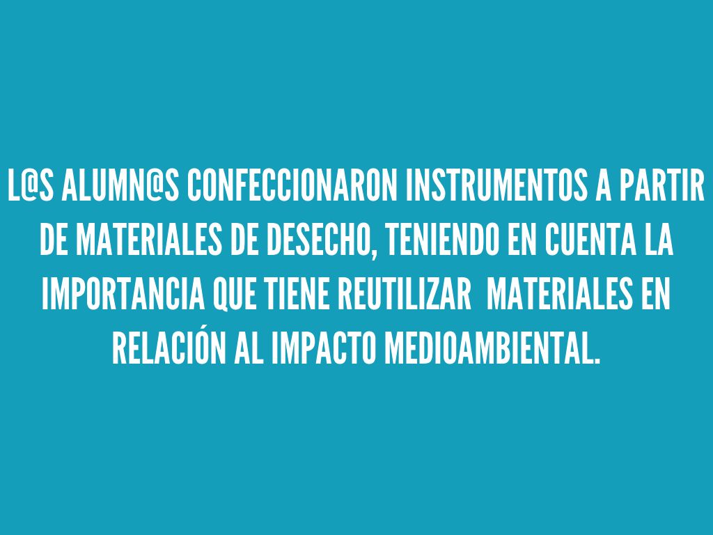 L@S ALUMN@S CONFECCIONARON INSTRUMENTOS A PARTIR DE MATERIALES DE DESECHO, TENIENDO EN CUENTA LA IMPORTANCIA QUE TIENE REUTILIZAR MATERIALES EN RELACIÓN AL IMPACTO MEDIOAMBIENTAL.