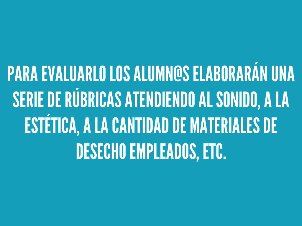 PARA EVALUARLO LOS ALUMN@S ELABORARÁN UNA SERIE DE RÚBRICAS ATENDIENDO AL SONIDO, A LA ESTÉTICA, A LA CANTIDAD DE MATERIALES DE DESECHO EMPLEADOS, ETC.
