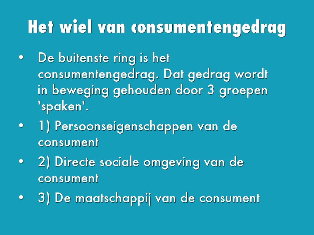 De buitenste ring is het consumentengedrag. Dat gedrag wordt in beweging gehouden door 3 groepen 'spaken'.