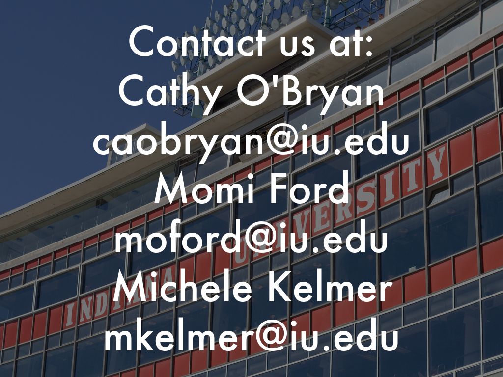Contact us at: Cathy O'Bryan caobryan@iu.edu Momi Ford moford@iu.edu Michele Kelmer mkelmer@iu.edu