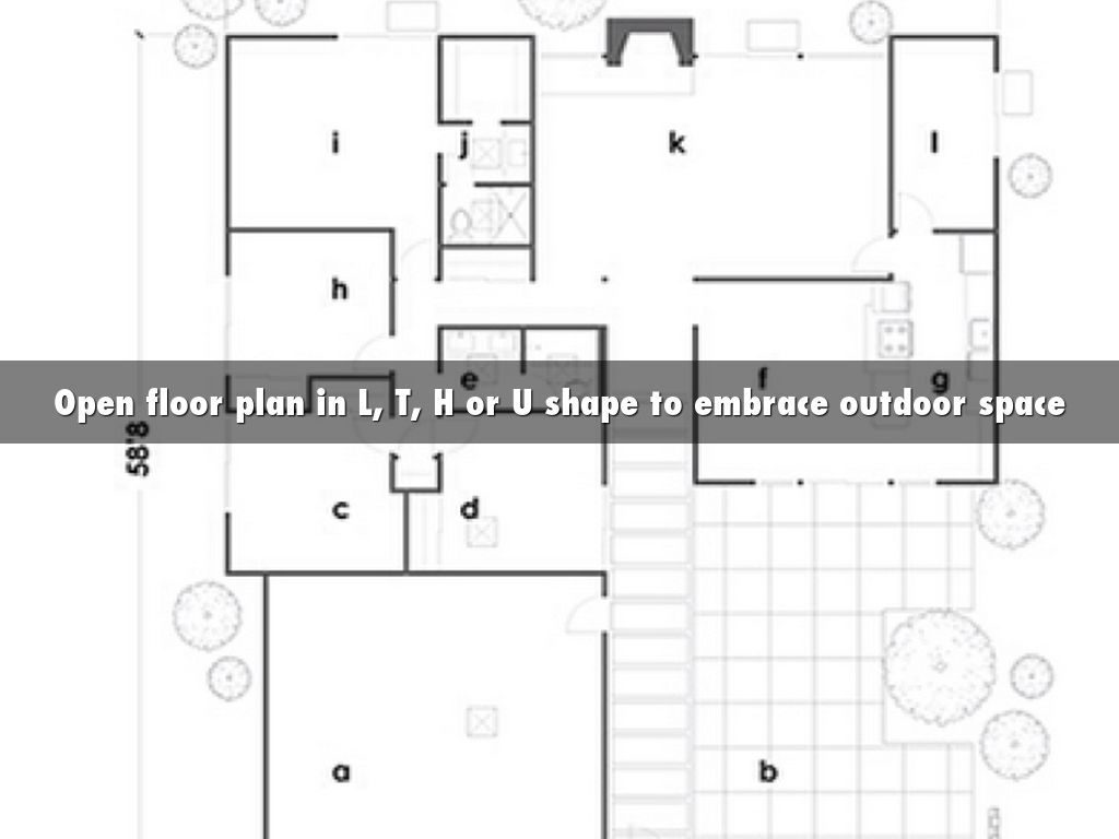 Open floor plan in L, T, H or U shape to embrace outdoor space