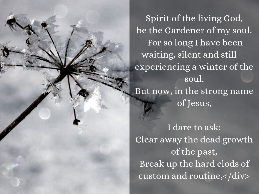 Spirit of the living God, be the Gardener of my soul. For so long I have been waiting, silent and still — experiencing a winter of the soul. But now, in the strong name of Jesus,
