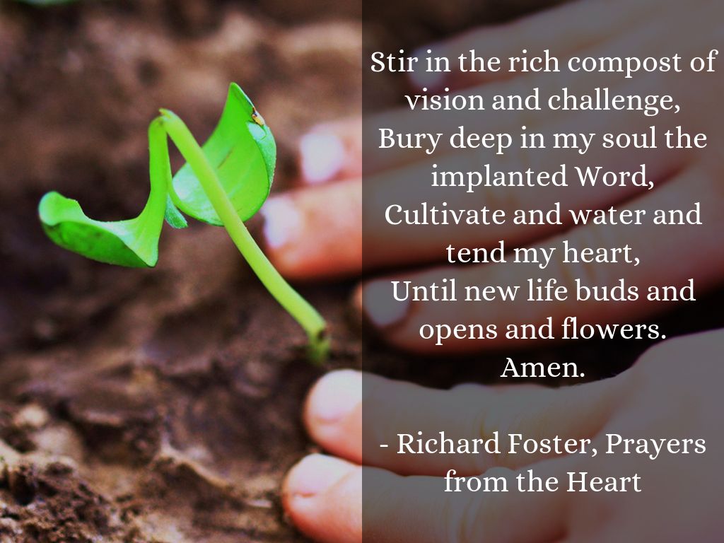 Stir in the rich compost of vision and challenge, Bury deep in my soul the implanted Word, Cultivate and water and tend my heart, Until new life buds and opens and flowers. Amen.