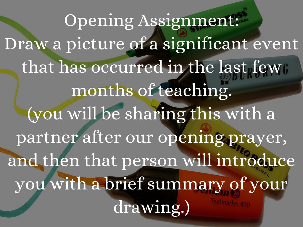 Opening Assignment: Draw a picture of a significant event that has occurred in the last few months of teaching. (you will be sharing this with a partner after our opening prayer, and then that person will introduce you with a brief summary of your drawing.)