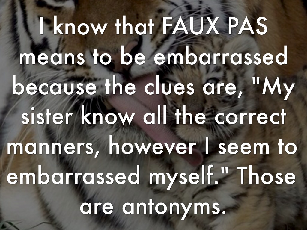 I know that FAUX PAS means to be embarrassed because the clues are, "My sister know all the correct manners, however I seem to embarrassed myself." Those are antonyms.