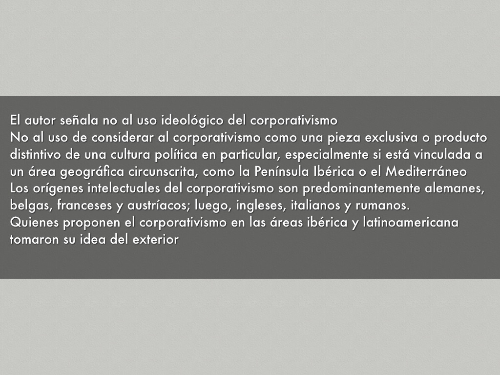 No al uso de considerar al corporativismo como una pieza exclusiva o producto distintivo de una cultura política en particular, especialmente si está vinculada a un área geográfica circunscrita, como la Península Ibérica o el Mediterráneo