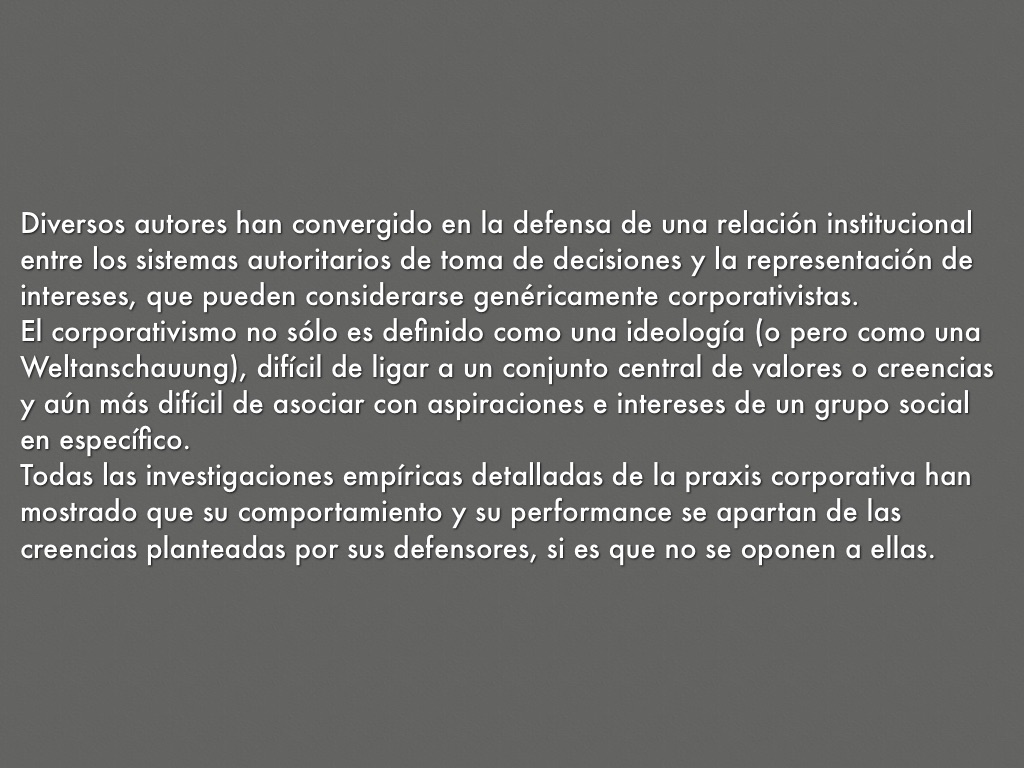 Diversos autores han convergido en la defensa de una relación institucional entre los sistemas autoritarios de toma de decisiones y la representación de intereses, que pueden considerarse genéricamente corporativistas.