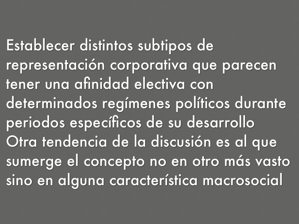 Establecer distintos subtipos de representación corporativa que parecen tener una afinidad electiva con determinados regímenes políticos durante periodos específicos de su desarrollo