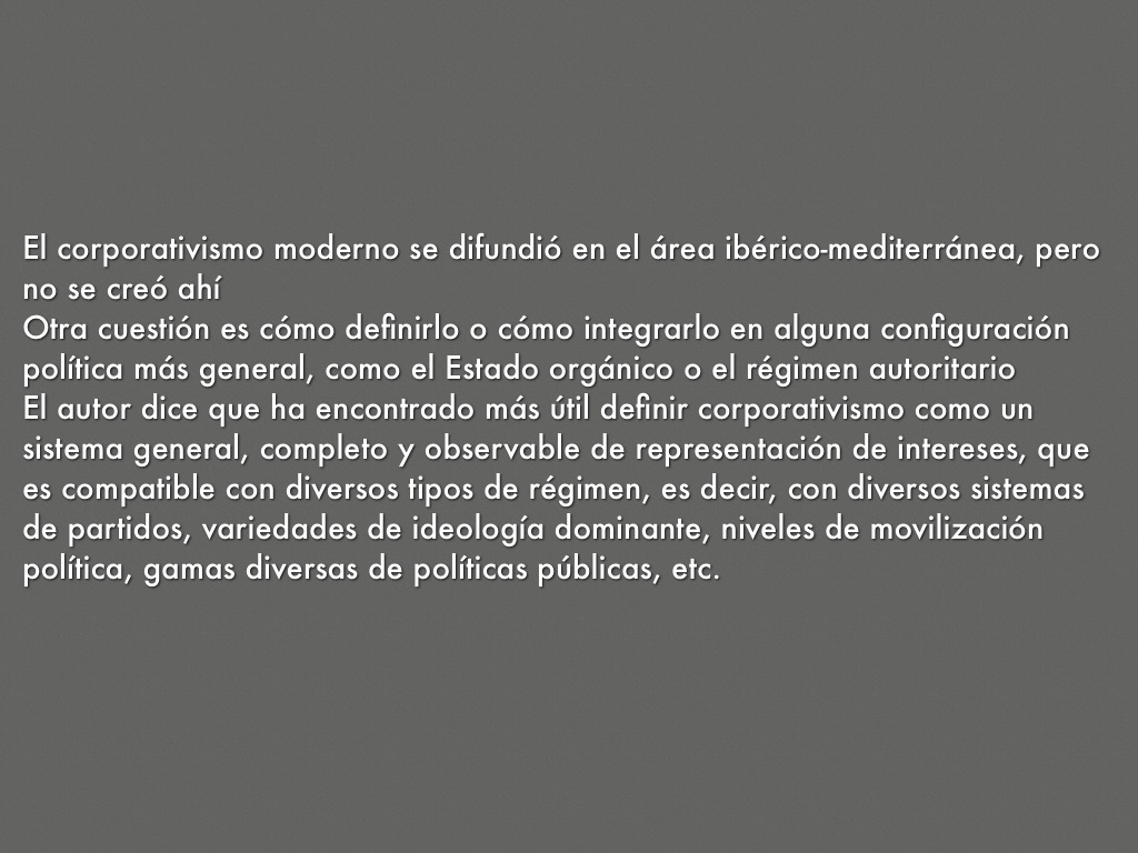 El autor dice que ha encontrado más útil definir corporativismo como un sistema general, completo y observable de representación de intereses, que es compatible con diversos tipos de régimen, es decir, con diversos sistemas de partidos, variedades de ideología dominante, niveles de movilización política, gamas diversas de políticas públicas, etc.