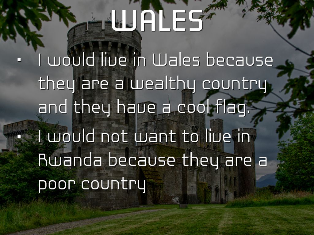 • I would live in Wales because they are a wealthy country and they have a cool flag.