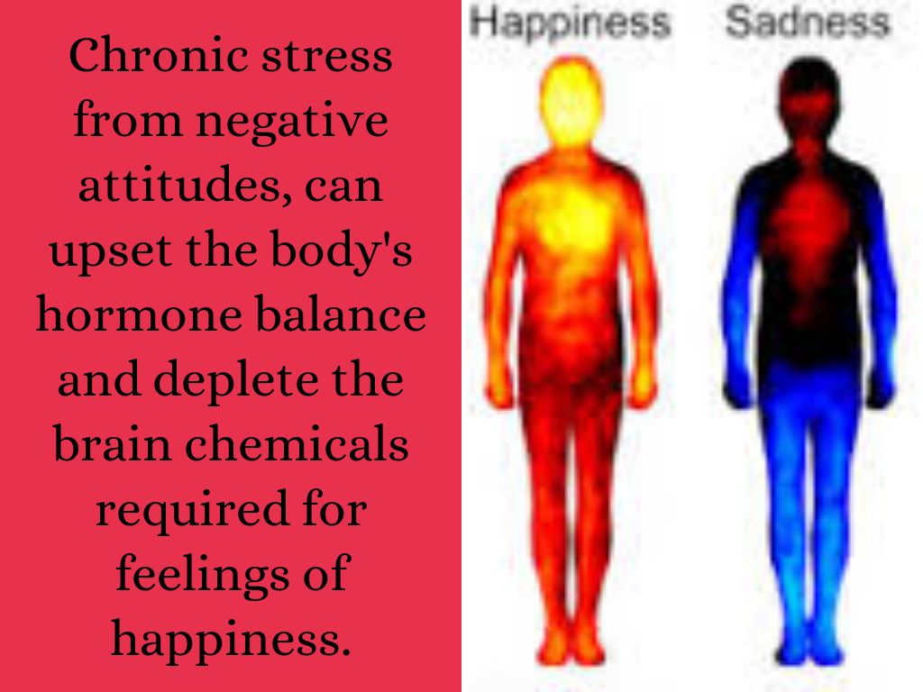 Chronic stress from negative attitudes, can upset the body's hormone balance and deplete the brain chemicals required for feelings of happiness.
