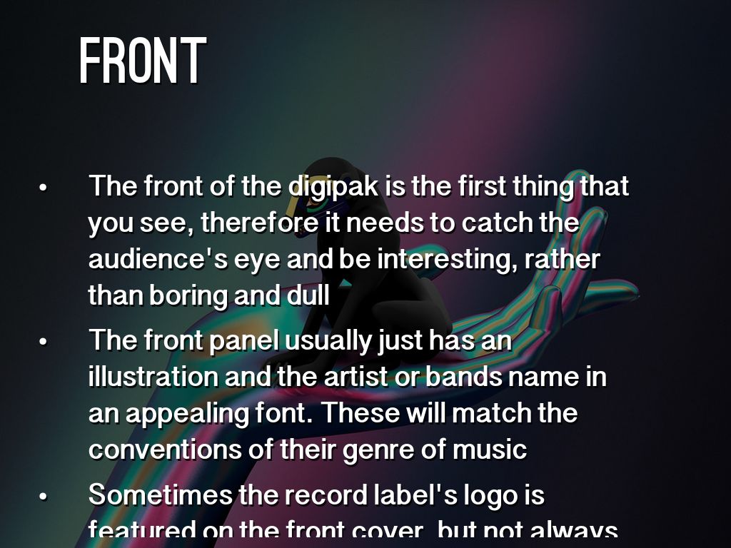 The front of the digipak is the first thing that you see, therefore it needs to catch the audience's eye and be interesting, rather than boring and dull