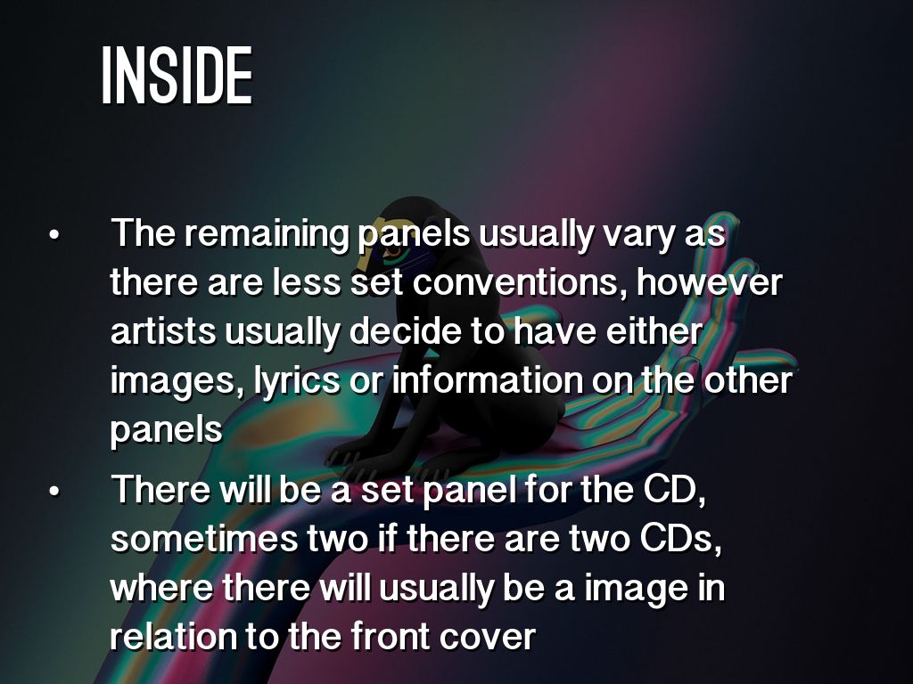 The remaining panels usually vary as there are less set conventions, however artists usually decide to have either images, lyrics or information on the other panels
