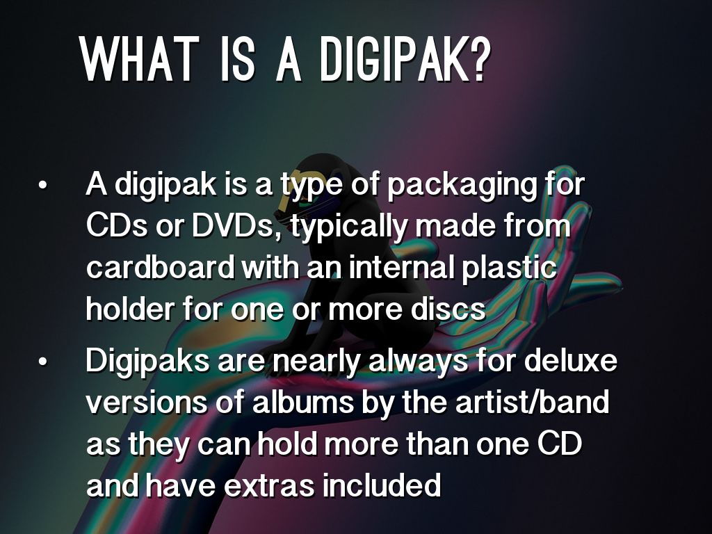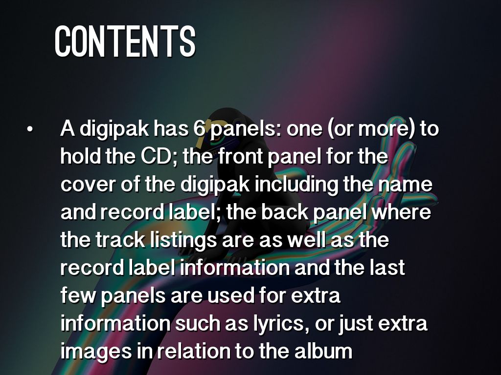 A digipak has 6 panels: one (or more) to hold the CD; the front panel for the cover of the digipak including the name and record label; the back panel where the track listings are as well as the record label information and the last few panels are used for extra information such as lyrics, or just extra images in relation to the album