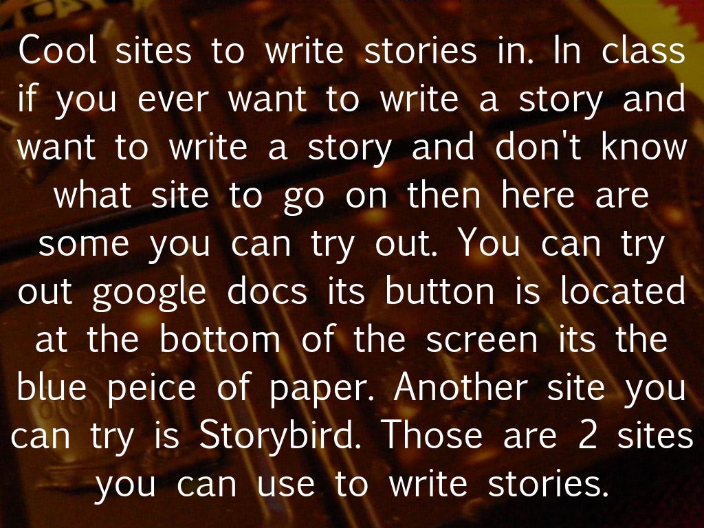 Cool sites to write stories in. In class if you ever want to write a story and want to write a story and don't know what site to go on then here are some you can try out. You can try out google docs its button is located at the bottom of the screen its the blue peice of paper. Another site you can try is Storybird. Those are 2 sites you can use to write stories.