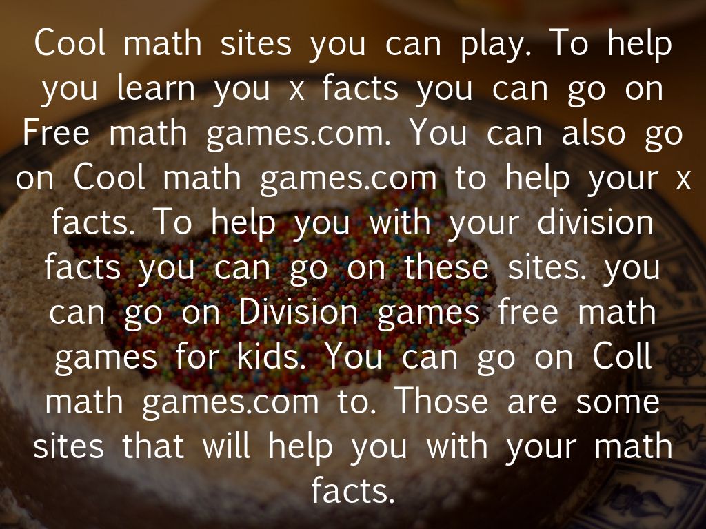 Cool math sites you can play. To help you learn you x facts you can go on Free math games.com. You can also go on Cool math games.com to help your x facts. To help you with your division facts you can go on these sites. you can go on Division games free math games for kids. You can go on Coll math games.com to. Those are some sites that will help you with your math facts.