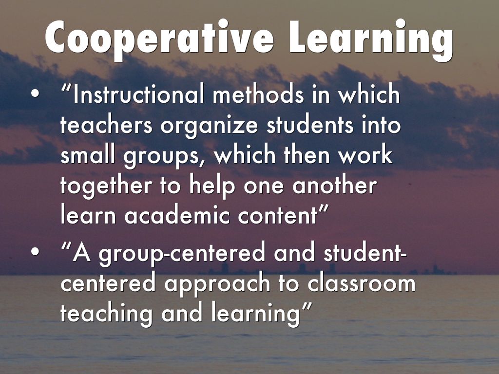 Although researchers vary in the exact phrasing of their definitions, essentially cooperative learning is at the very least “a group-centered and student-centered approach to classroom teaching and learning”