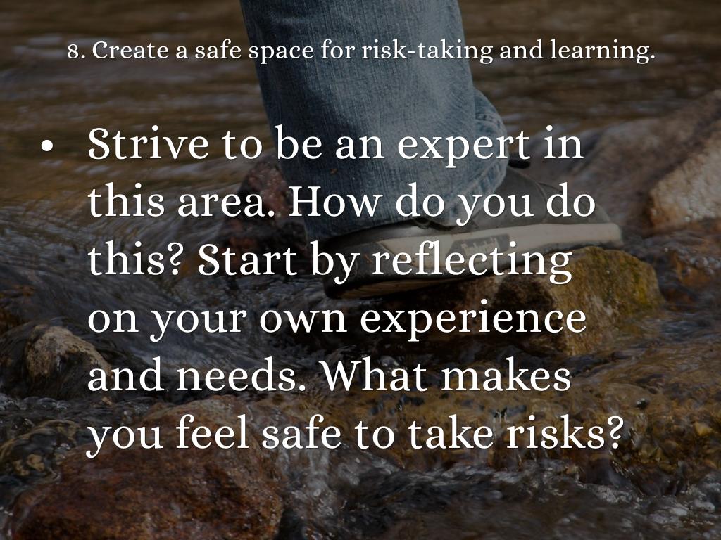 • Strive to be an expert in this area. How do you do this? Start by reflecting on your own experience and needs. What makes you feel safe to take risks?